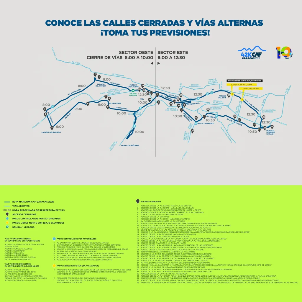 El domingo 8 de febrero el Parque Sucre Los Caobos, punto de salida de la carrera, contará con acceso libre para todo el público, incluidos los familiares y amigos de corredores, exclusivamente por la Plaza de Los Museos. Por su parte, la entrada por Plaza Venezuela estará reservada para los corredores con número, sin importar la distancia para la que se inscribieron. Este mismo punto servirá de salida para que los corredores de la distancia 10K se ubiquen en su corral.